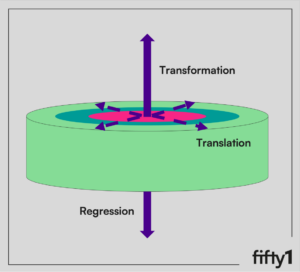 - Translation (oder Veränderung) ist häufig das, was wir unter Change verstehen: Es geht um die Anpassung bestehender Prozesse und Strukturen. Hierbei werden bestehende Systeme optimiert, ohne die grundlegende Denkweise oder die kulturelle Ausrichtung der Organisation zu verändern. Change bedeutet, dass man mit den gegebenen Rahmenbedingungen arbeitet, Effizienzsteigerungen anstrebt oder Prozesse verbessert, aber die grundlegende Struktur bleibt unverändert.